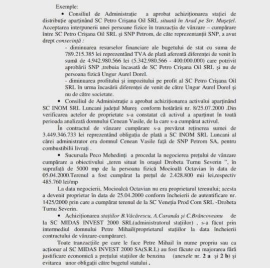 Concret, Petrom a cumparat mai multe stații de distribuție a carburanților de la o persoană fizică, la prețuri uriașe, și a evitat plata obligațiilor către bugetul de stat. Un exemplu din document, este tranzacția cu SC Midas Invest 2000, derulata prin intermediul lui Petre Mihail. Această afacere arată cum s-a sustras Petrom de la plata către bugetul statului a obligatiilor fiscale de circa 14 miliarde de lei, bani care reprezentau TVA-ul și impozitul pe profit. Autoritățile au ignorat neregulile și au închis ochii, deși se foloseau fraudulos sume importante din bugetul statului, adică peste 200 miliarde de lei, numai în acest caz.