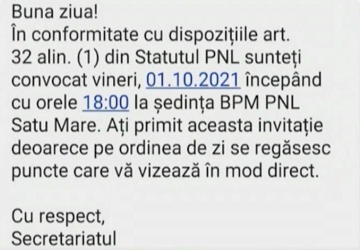 SMS-ul mă invită la o ședință, menționând că sunt subiecte pe ordinea de zi care mă implică direct și amintește de un articol din statut care face referire la sancționare sau excludere.