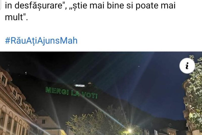 Prin aceste proiecții oamenii erau încurajați să iasă la vot, să producă o schimbare. „Start evolutiei”, „stop coruptiei”, „meriti mai mult”, „schimbarea e aproape”, au fost câteva dintre mesajele proiectate pe Tâmpa.Mai multe imagini, aici: https://www.facebook.com/vavedemdinbrasov/posts/1152379618496804
