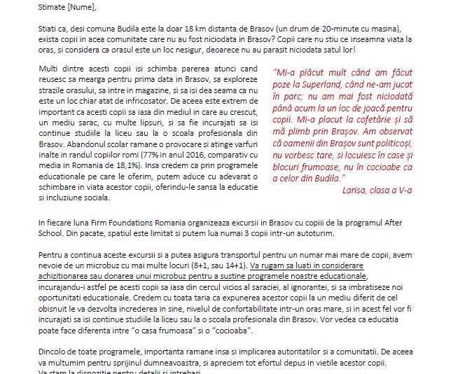 . Asta deoarece unii micuți nu au părăsit niciodată Budlia, nu au văzut un mediu diferit, iar noi ne dorim să le oferim experiențe noi, inedite, să vadă altceva, nu doar satul lor. Mulți doar visează să ajungă la Grădina Zoologică sau în centrul Brașovului. Vrem să-i ajutăm să se simtă în siguranță într-un oraș mare și să le creștem curiozitatea pentru viață