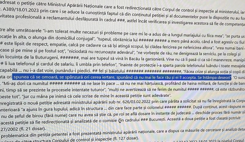 În plus, spune fosta soacră, șeful corpului de control al MApN a amenințat că se poate folosi de funcția sa pentru a-i face rău. Nu este clar cum un om care a avut abateri atât de grave de conduită ocupă acum postul de Șef al Corpului de Control și Inspecție din cadrul Ministerului Apărării.