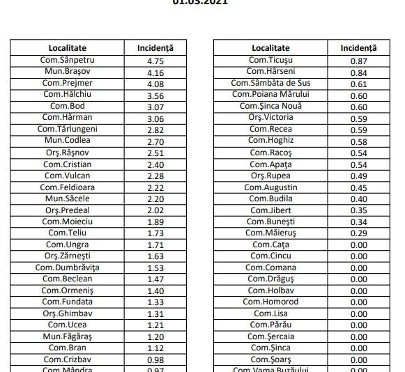 În creștere este și incidența din municipiul Brașov, de la 4,06 la mia de locuitori ieri, la 4,16 astăzi. De altfel, 6 localități din județ au rata de infectare peste 3 la mia de locuitori. Situația completă, mai jos:
