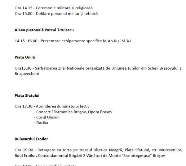 Astfel, Instituția Prefectului Județul Brașov, în parteneriat cu Consiliul Județean Brașov și Primăria Municipiului Brașov, cu sprijinul Garnizoanei Brașov au stabilit următorul program: